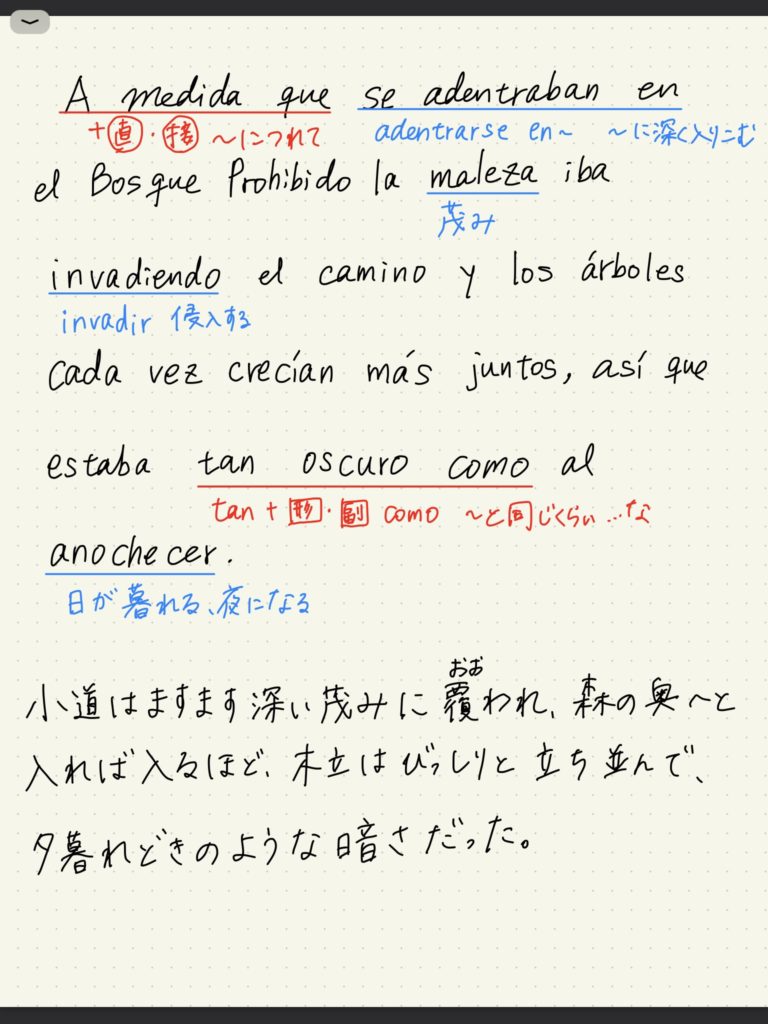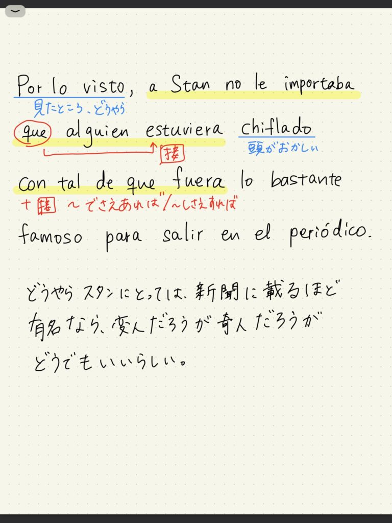 やはり速読だけでなく、単語を調べたり文法をじっくり理解しながら精読した方がさらに勉強になります。スペイン語での読書が勉強兼趣味になっていたので、毎回精読をおこなってはいませんでしたが、たまに、既に読んだ箇所を写経(そのまま文章を書き写す)して、文法や単語を調べたり翻訳したりしながら精読していました。